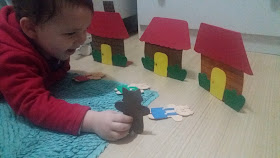 Bem, vou explicar como fiz e como funciona o material, abaixo vou mostrar nas fotos bem certinho como funciona, mas a casinha de tijolos, coloquei atrás um potinho de iogurte com pedras dentro, então você pode soprar bastante e ela não cai, o máximo que acontece é ela andar um pouquinho em pé para trás,mas não cai. Na de madeira e palha colei um rolo de papel higiênico, daí é só dar uma sopradinha e ela cai. Fiz todo o material de EVA.