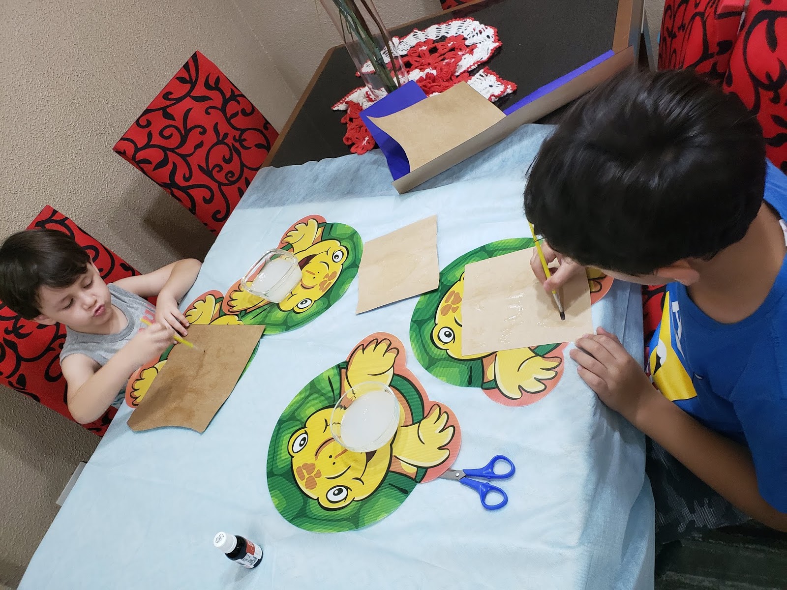 Usando pincel, escreva ou desenhe em um papel marromDeixe secar por cerca de uma hora, nesse dia os meninos tomaram banho, colocaram pijama enquanto secava
